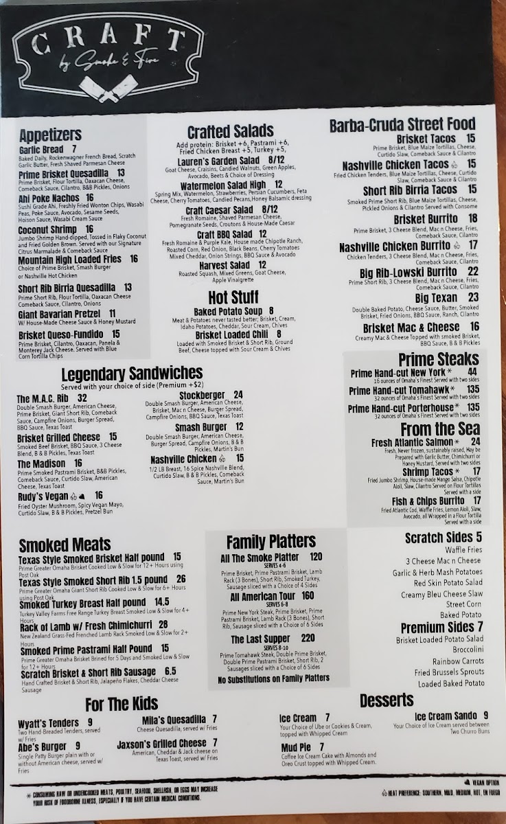 Craft by Smoke and Fire specializes in offering a diverse selection of barbecue delights that cater to every palate. Start your culinary adventure with their renowned brisket grilled cheese, where tender brisket is sandwiched between crispy, buttery bread oozing with melted cheese—a comfort food classic that never disappoints. If you're in the mood for something a bit spicier, the Nashville hot chicken sandwich presents a fiery punch that's both crispy and succulent, perfectly balanced with cool toppings that enhance its flavor. Vegans will also find a gem with Rudy's Vegan, showcasing the restaurant’s commitment to inclusivity in their menu offerings.